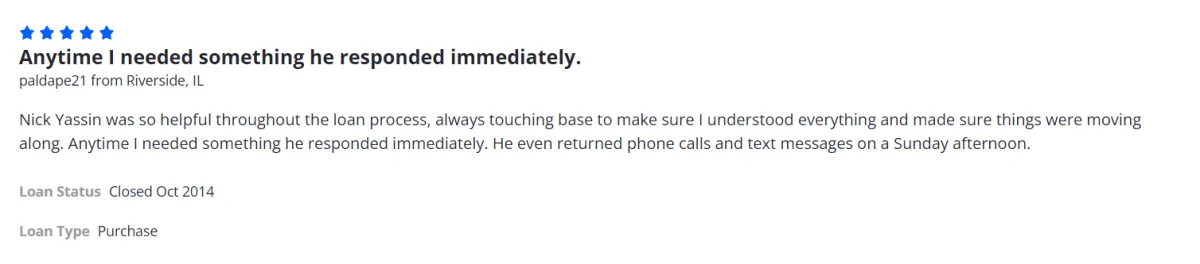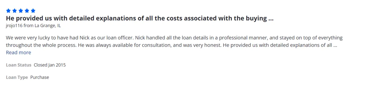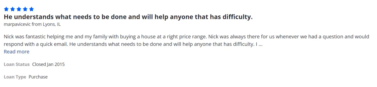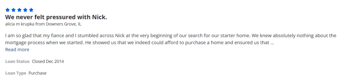 Very helpful overall with our repeated questions about the overall process and made everything happen quickly and painless. Appreciate the wonderful care Nick and his team gave us to help us with the entire mortgage process. We would definitely recommend him highly to our family and friends.